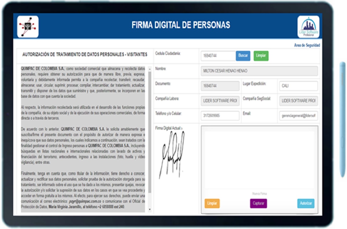 Es una Plataforma Tecnológica Líder en el mercado, que garantiza la eficiencia de los procesos y gestión de control de acceso a los empleados, visitantes y contratistas, utilizando dispositivos de terminales biométicros de reconocimiento de rostros, palmas, y detención de temperatura en línea. Tambien, se utiliza tablets para el registro de autorización de tratamiento de datos personales en la compañía.