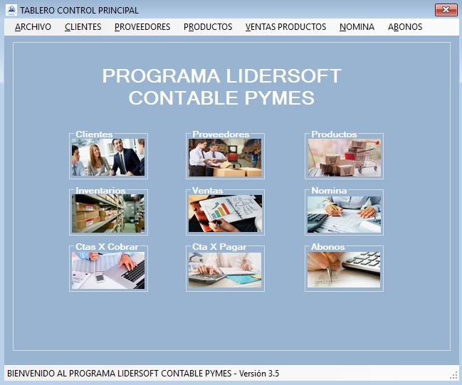 Los módulos principales son de gestión de Clientes, Proveedores, Productos, Inventario, Ventas, Nomina, Cuentas por Cobrar, Cuentas por Pagar, Abonos, Facturaciones, Remisiones, y Múltiples Tipos de Reportes.